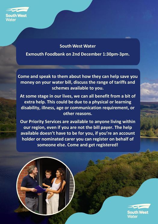 Exmouth Food Bank is preparing to host a free drop-in event with South West Water’s community liaison team who’ll be on hand to answer queries and offer bespoke billing support.