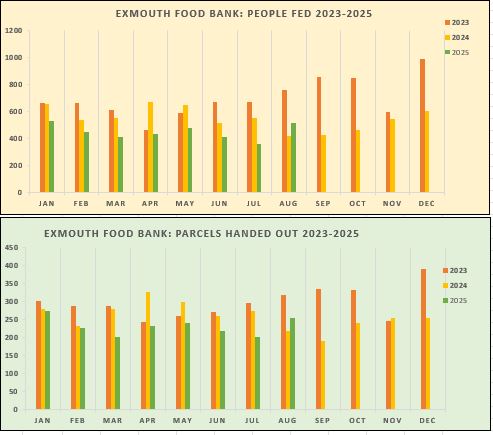 In 2024 our loyal team of volunteers packed and distributed over 3100 parcels that provided food for 6,580 people. During the summer months of 2025 we experienced a seasonal influx of homeless males, many seeking work in the local pubs & restaurants in Exmouth. We worked closely with East Devon District Council to ensure that, wherever possible, these individuals were able to come off the street & access temporary accommodation. In addition, particularly during August, we saw a sharp increase in families seeking help to provide food for their children during the summer holidays.