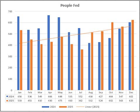 The demand for our services continued to rise from September through to December and month on month we provided more food to those in need than during the same period in 2024. Reasons for this included the fact that the price of staple foods continued to rise which, when compounded with rising utility bills during the winter months, forced those who were 'just about coping' to seek help, particularly towards the end of a month. At the same time we also experienced a rise in people being referred to us as a result of benefit delays and appeals as the government was replacing Employment and Support Allowance (ESA) with Universal Credit (UC)
